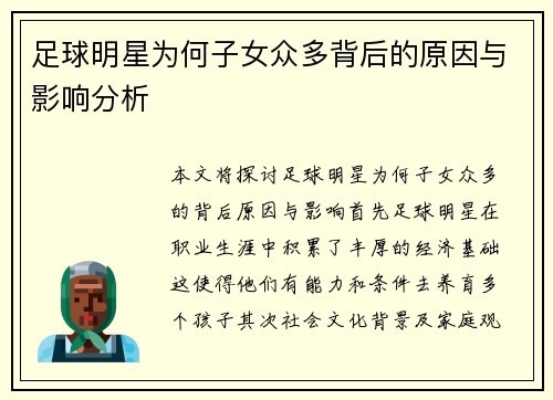 在足球的世界里,明星球员不仅以他们出色的技术和表现而闻名,更因他们独特的名字与传奇故事而备受关注。本文将从四个方面对“最野足球明星名字全解析与传奇故事分享”进行深入探讨。首先,我们将分析一些传奇球员的名字背后的寓意及其文化渊源,了解这些名字如何影响他们的职业生涯。接着,我们将回顾几位名将的成长历程,探索他们是如何一步步成为全球瞩目的焦点。随后,我们将讨论这些足球明星们在场内外的精彩故事,以及他们如...
