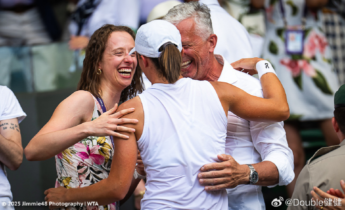 今年温网,斯瓦泰克在夺冠后和现场观战的姐姐、爸爸一起相拥庆祝,她的妈妈则一直没有现身。